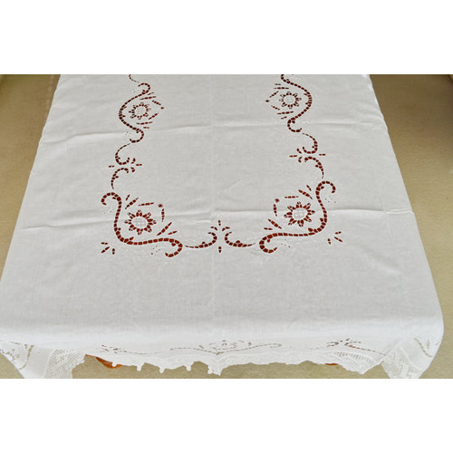 This item is an exquisite pure linen Banquet Tablecloth set including a hand embroidered tablecloth measured 72 " x 108" with 16.5" wide drop lace edging and 8 matching napkins.